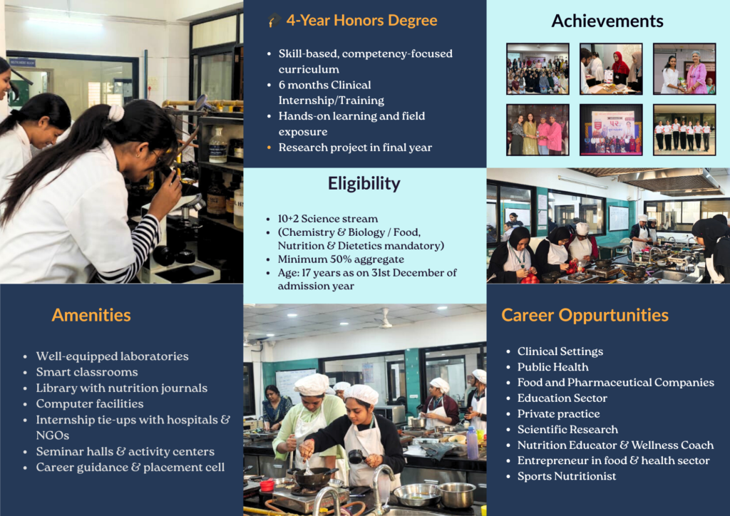 From the academic year 2026 onwards, the program has been upgraded and is now offered as a Bachelor’s in Nutrition and Dietetics under the framework of the National Commission for Allied and Healthcare Professions (NCAHP), aligning with the vision of “One Nation, One Syllabus.” This transition ensures a standardized, industry-relevant curriculum that enhances professional recognition, employability, and opportunities in the healthcare and nutrition sectors at a national level.