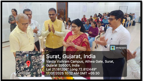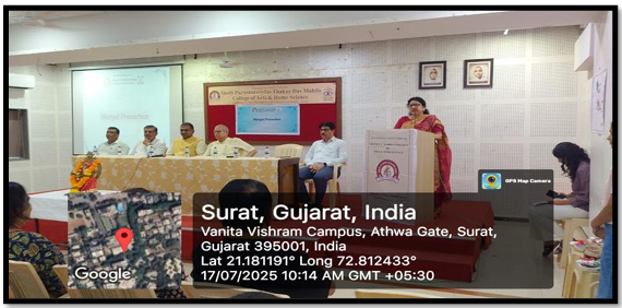 The Mangal Pravachan for the first-year students was held on 17th July 2025 at 9:30 AM. The event was graced by dignitaries including Dr. Smita Bhatt (Principal of the college), Shri Manhar C. Desai (Secretary of Vanita Vishram), Heads of various Departments, and other faculty members. The program was hosted by Ms. Anjali Vatwani.
